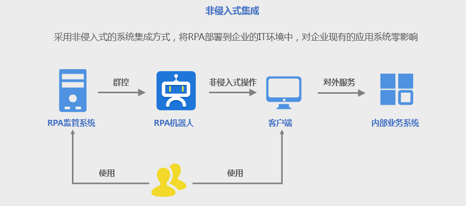 3、德讯RPA采用非侵入式的系统集成方式,将流程机器人部署到企业的IT环境中,对企业现有的应用系统零影响。